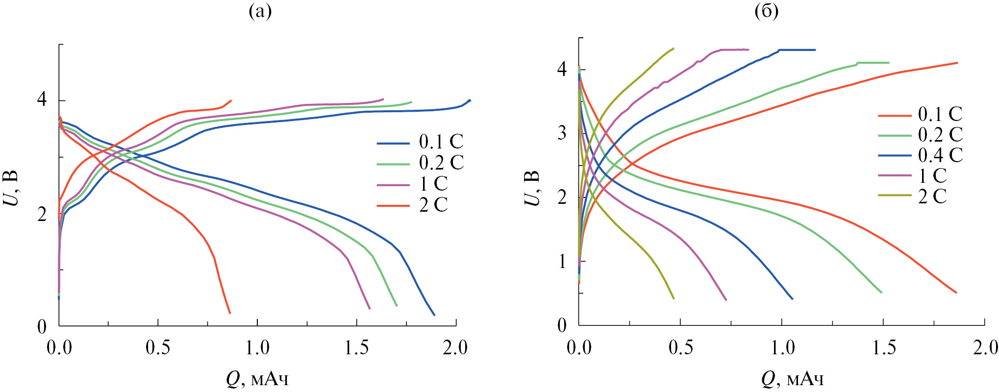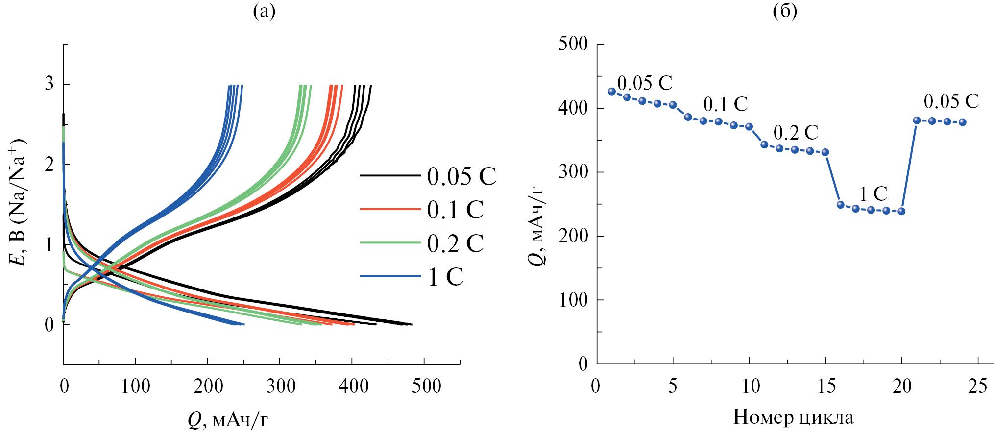 При тестировании макетов натрий-ионных аккумуляторов первые два формировочных цикла проводили в следующем режиме: заряд при постоянном токе 0.1 С до напряжения 4.1 В, далее следовал заряд при постоянном напряжении до спада тока до 0.05 С, разряд при постоянном токе 0.1 С до напряжения 0.4 В. Последующие циклы проводили в таком же режиме при токах 2, 0.4, 1 и 2 С. Ток, равный 2 мА, соответствовал режиму 1 С.