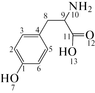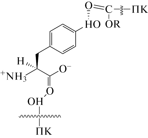 При смешении ПК с Tyr в спектре 13С ЯМР наибольший сдвиг на 5.77 м.д. в сторону слабого поля наблюдается для сигнала атома углерода С(1) ароматического кольца, непосредственно связанного с гидроксильной группой. Также можно отметить значительный сдвиг сигнала углерода карбоксильной группы С11 на 0.55 м.д. (табл. 1). В ИК-спектре комплекса ПК-Tyr интенсивность ПП n(С=О) ПК и ПП n(С=О в СОО–) Tyr резко уменьшается и сдвигается в область больших и меньших длин волн соответственно на 4 и 9 см–1. Также происходит низкочастотный сдвиг ПП n(–ОН) в области 3600–3000 см–1 и высокочастотный сдвиг ПП n(С–О) и n(С–С) пиранозного кольца на 4–8 см–1. Очевидно, формирование комплексов ПК-Tyr протекает через координацию одной молекулы аминокислоты и одного углеводного звена полисахарида с образованием между ними межмолекулярных связей с участием кислородсодержащих функциональных групп основной цепи ПК и карбоксильной и гидроксильной групп Tyr с образованием следующей структуры: