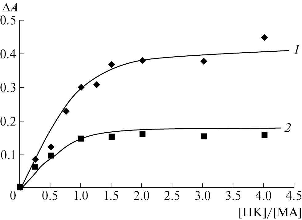 Рис. 3. Кривые насыщения смеси ПК с МА. ПК+Ind (1), ПК+Tyr (2); CПК = 1.0×10–4моль/л, CМА = 1.0×10–4моль/л, 25 °С, l = 1.0 см, растворитель – вода