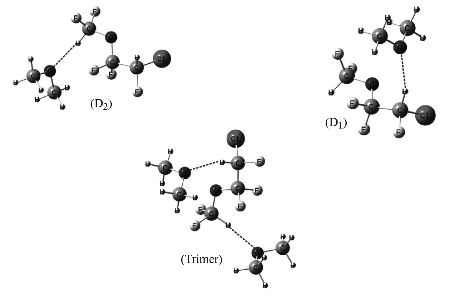 На рис. 4 представлены оптимизированные структуры двух димеров D1, D2 и тримера, соответствующие реальным минимумам на поверхности потенциальной энергии (PES). В качестве обозначений димеров энфлюрана с ДМЭ предложены: D1 для комплекса с ВС типа FClCH…ДМЭ и D2 с ВС типа F2CH…ДМЭ соответственно. В таблице 1 представлены некоторые параметры найденных комплексов. Из расчета (MP2/6-311++G(df, pd)) следует, что первый димер несколько прочнее второго (соответственно, –4.95 ккал/моль и –4.55 ккал/моль – с СР2-коррекцией). Тример почти в 2 раза прочнее (–9.41 ккал/моль). Максимальный рост интенсивности почти в 6 раз предсказывается для полосы ν2 при образовании димера D1 и тримера. В тоже время, интенсивность полосы ν1 практически не меняется. Оба результата находятся в соответствии с экспериментальными наблюдениями.
