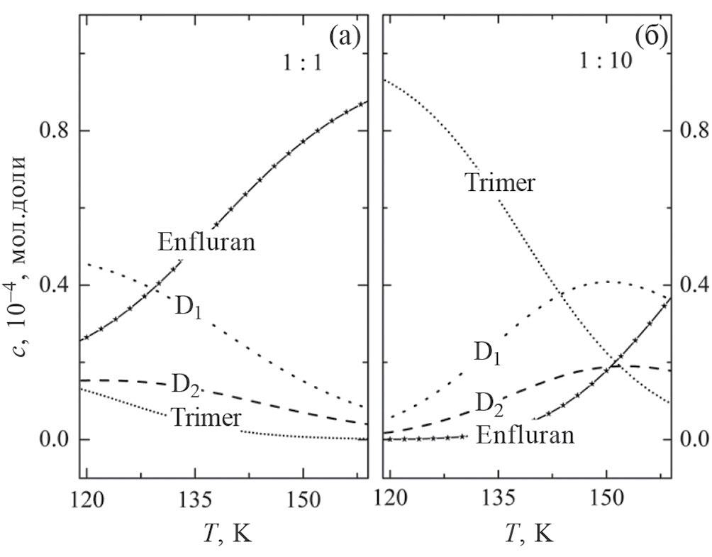 Решая систему уравнений (3)–(5) c использованием оценки константы равновесия, можно получить концентрацию димеров, тримера и мономеров в мольных долях. На рис. 5 представлены температурные зависимости концентраций димеров, тримера и мономера энфлюрана в смеси при различных температурах. Видно, что при небольших и одинаковых концентрациях донора и акцептора даже при минимальной температуре 120 К содержание тримеров мало. Максимальную концентрацию имеет наиболее прочный димер D1. Концентрация димера D2, по-видимому, сильно недооценена. Рост температуры приводит к увеличению концентрации свободного энфлюрана (и эфира) и уменьшению концентрации всех комплексов. За исключением недооценки содержания димера D2 расчет находится в соответствии с результатами измерений, по крайней мере, на качественном уровне. При значительном превышении содержания ДМЭ (правая часть рис. 5) концентрация тримеров существенно выше концентрации димеров и несвязанного энфлюрана при 120 К. Однако, как и в эксперименте, повышение температуры приводит к уменьшению содержания тримеров в пользу димеров и мономеров.