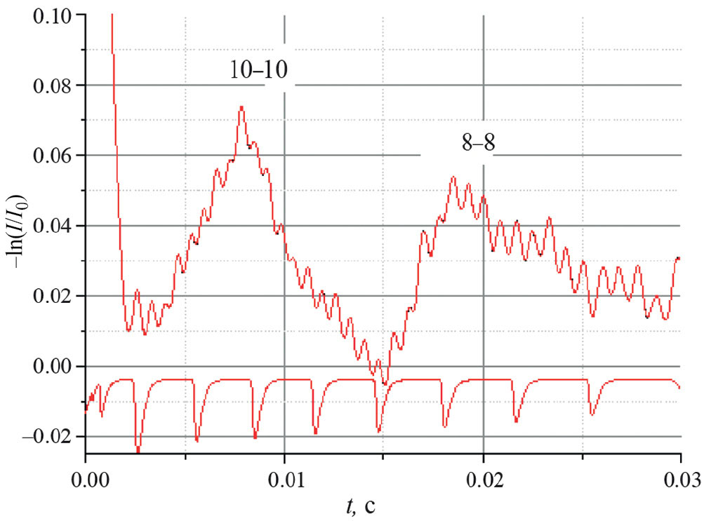 На рис. 3 представлена осциллограмма, на которой показан управляющий импульс тока, сигнал пропускания атмосферы, на котором видно две линии поглощения СК (с изменением вращательного числа 8–8 и 10–10), и спектр пропускания интерферометра. Расстояние между соседними пиками сигнала с интерферометра составляет 10 ГГц. На рис. 4 представлен обработанный спектр поглощения линий СК. Линии переходов соответствуют изменению вращательного квантового числа 8–8 и 10–10. Также представлен сигнал с интерферометра, который необходим для преобразования оси абсцисс в ось частот.