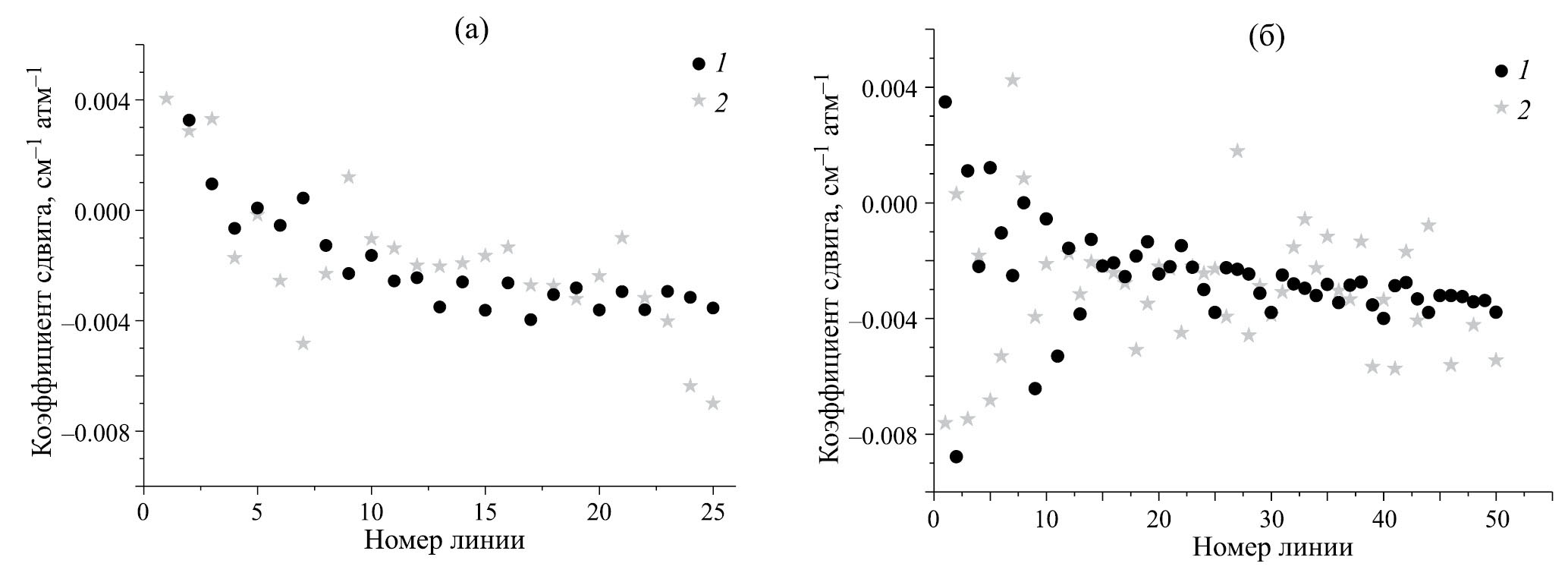 Несмотря на важность изучения параметров контура линий оксида серы как для астрофизических, так и земных исследований, к настоящему времени имеется только одна работа [5], где приводятся коэффициенты сдвига линий SO2-CO2. В этой работе [5] данные были получены на фурье-спектрометре Bruker IFS125 HR с разрешением 0.002–0.003 см–1 и отношением сигнала к шуму 1500 в области 2450–2530 см–1. Параметры линий были восстановлены с помощью процедуры мультиспектральной подгонки [6, 7], в которой нелинейный метод наименьших квадратов применялся одновременно к спектрам, зарегистрированным в различных экспериментальных условиях. Были определены параметры для 1421 линии в полосе ν1+ν3 и для 254 линий в горячей полосе ν1+ν2+ν3–ν2 основной изотопической модификации 32S16O2, а также для 116 линий полосы ν1+ν3 изотополога 34S16O2 [5]. Сдвиги малы для абсолютного большинства линий, в среднем они составляют ~0.003 см–1атм–1. Статистическая погрешность определения сдвигов линий достаточно велика (достигает 100%). К основным источникам неопределенностей относятся положение базовой линии, возмущение из-за соседних линий и неопределенность измерений парциальных давлений оксида серы и углекислого газа. Неопределенности подгонки коэффициента сдвига давлением CO2 во многих случаях довольно велики из-за сильного перекрывания линий [5]. Разброс значений сдвигов линий в полосе ν1+ν3 для основной изотопической модификации 32S16O2 составляет от –0.03363 до 0.02142 см–1атм–1, при этом вращательные квантовые числа нижнего состояния J и Ka находятся в пределах от 0 до 70 и от 0 до 21 соответственно. Величины сдвигов линий в горячей полосе ν1+ν2+ν3–ν2 варьируются в диапазоне от –0.03748 до 0.0293 см–1атм–1, квантовые числа J и Kа – от 12 до 47 и от 0 до 13 соответственно. Коэффициенты сдвига линий в полосе ν1+ν3 изотополога 34S16O2 – от –0.07288 до 0.03015 см–1атм–1, квантовые числа J и Kа – от 4 до 36 и от 0 до 13 соответственно. У экспериментальных данных не наблюдаются четких зависимостей от вращательных квантовых чисел J и Ka.