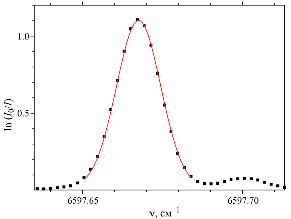 При аппроксимации использовался фиксированный вклад столкновительного уширения, равный 0.0007 см–1 при давлении 3 Торр и 0.0014 см–1 при давлении 6 Торр. Варьировались оставшиеся параметры – центр линии, Гауссова ширина и интенсивность. Поскольку измерения проделаны при низком давлении, форма контура была очень близка к Гауссовой функции. Использование функции Фойгта взамен Гауссовой позволило учесть поправку порядка 2–3% в интенсивности, возникающую из крыльев линии.