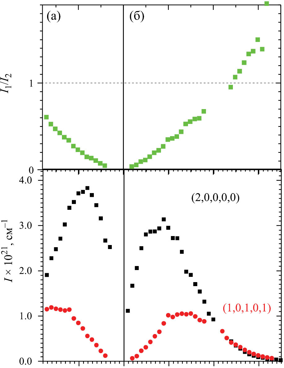 где коэффициенты aJ и bJ описывают вклад состояний (2,0,0,0,0) и (1,0,1,0,1) в смешанное состояние. Если считать, что дипольный момент перехода для смешанного тона (1,0,1,0,1) намного меньше дипольного момента обертона (2,0,0,0,0), то отношение приведенных на рис. 5 интенсивностей пропорционально (bJ/aJ)2. Например, для J ≈ 25, когда это отношение становится равным 1, смешанное состояние имеет одинаковые вклады Ψ1,J и Ψ2,J. Можно полагать, что и в P-ветви при J ≈ 25 интенсивности линий обеих полос должны сравняться друг с другом.