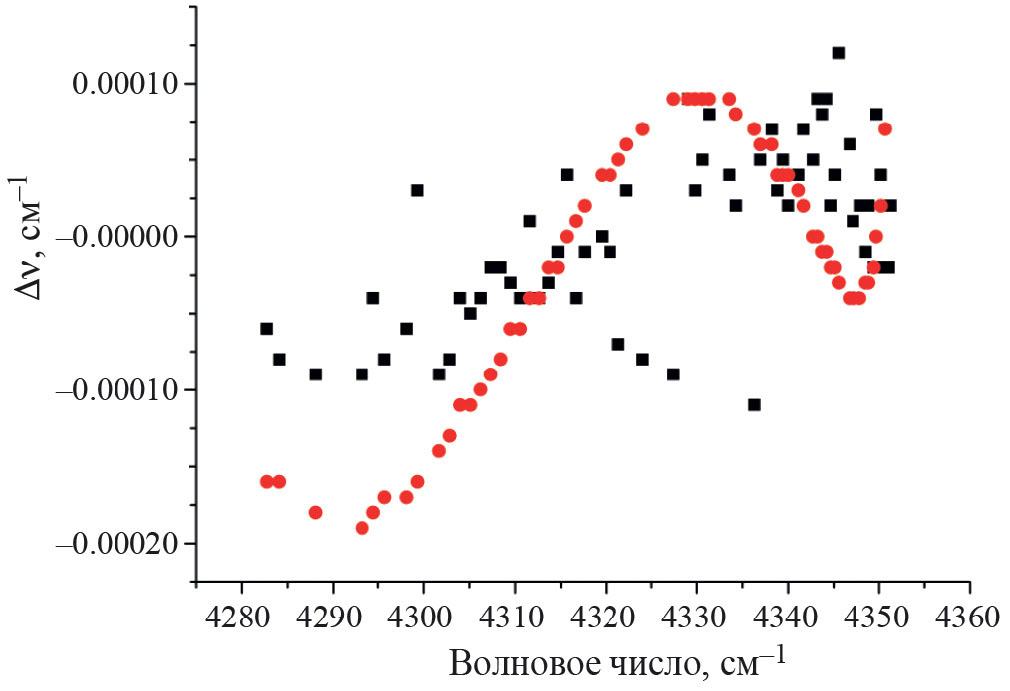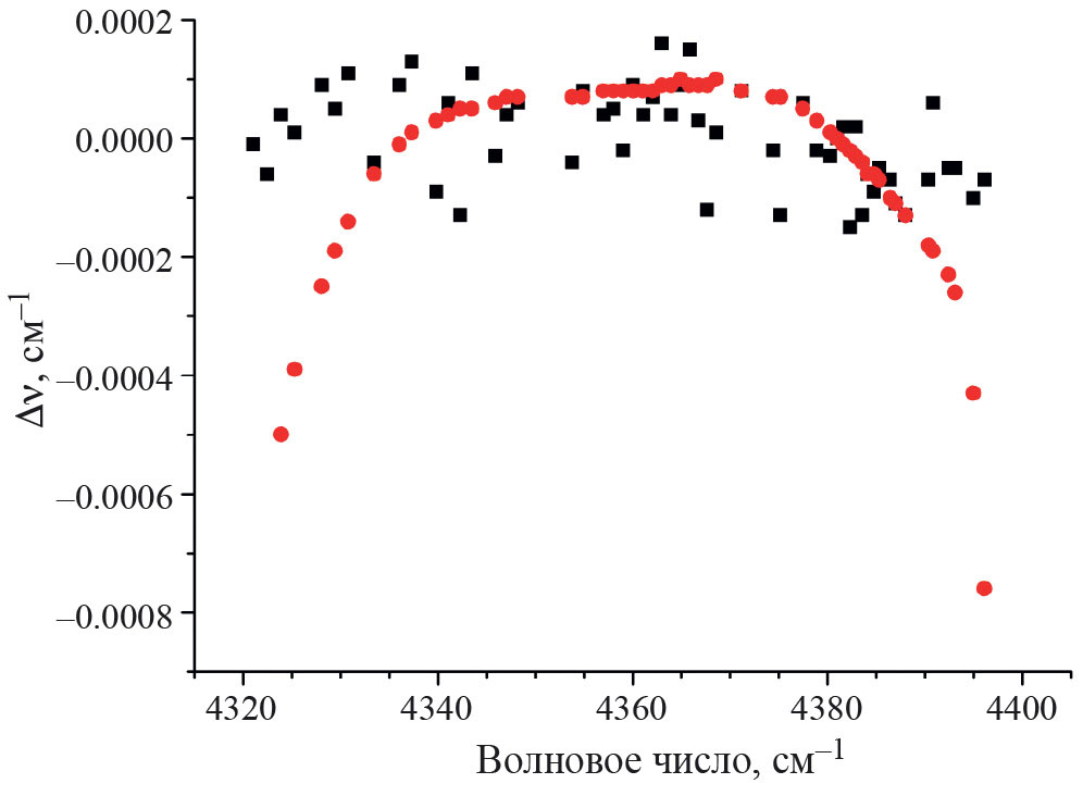 Рис. 4. Отличие измеренных центров линий полосы ν1 + 2ν2 + ν3 изотополога 15N15N18O в данной работе (черные квадраты) и измерений работы [7] (красные кружки) от рассчитанных значений