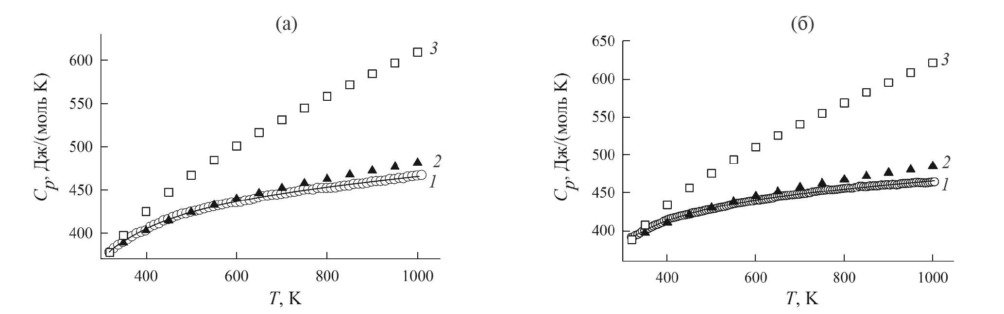 Высокотемпературную теплоемкость измеряли методом дифференциальной сканирующей калориметрии на термоанализаторе STA 449 C Jupiter (NETZSCH, Германия). Методика экспериментов описана ранее [10]. Скорость нагревания при исследовании теплоемкости составляла 20 K/мин. Ошибка измерения теплоемкости эталона (α-Al2O3) во всем изучаемом интервале температур не превышала 2%. Экспериментальные данные обрабатывали с помощью пакета программ NETZSCH Proteus Thermal Analysis и лицензионного программного инструмента Systat Sigma Plot (“Systat Softwere Inc.” США).