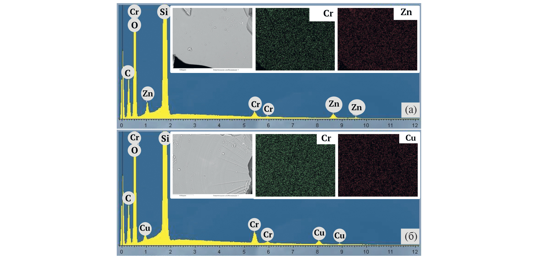 Рис. 2. СЭМ–РСМА для образцов: а) 1Zn3Cr/SiO2, б) 1Cu3Cr/SiO2.