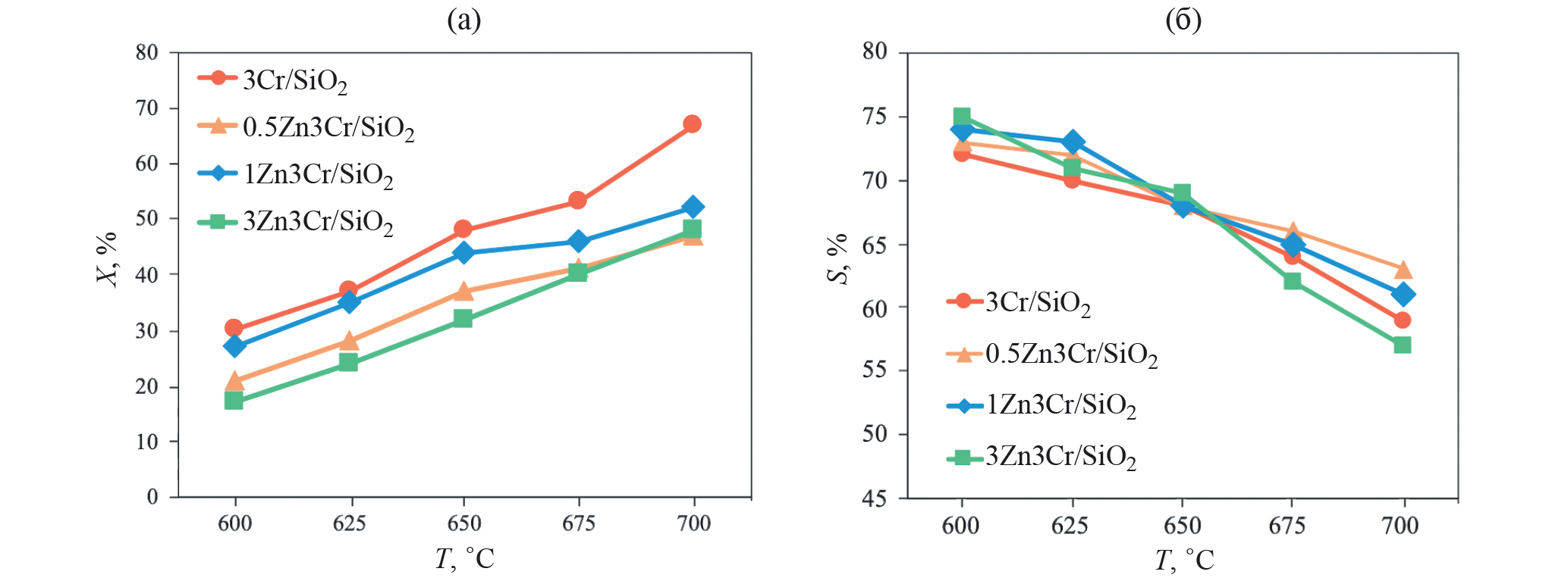 Рис. 4. Зависимости конверсии пропана (а) и селективности по пропилену (б) от температуры на образцах 3Сr/SiO2, 0.5Zn3Cr/SiO2, 1Zn3Cr/SiO2, 3Zn3Cr/SiO2.