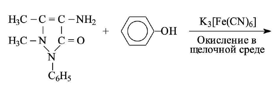 Для определения фенола в исследуемом образце пробу анализируемого препарата (5 мл) помещали в мерную колбу на 100 мл, прибавляли 1 мл буферного раствора, 1.5 мл 0.6%-го водного раствора 4-аминоантипирина, 1 мл 8%-го водного раствора K3[Fe(CN)6], доводили объем дистиллированной водой до метки и тщательно перемешивали. Через 5 минут замеряли оптическую плотность раствора при λ = 540 нм и по калибровочному графику находили концентрацию фенола.