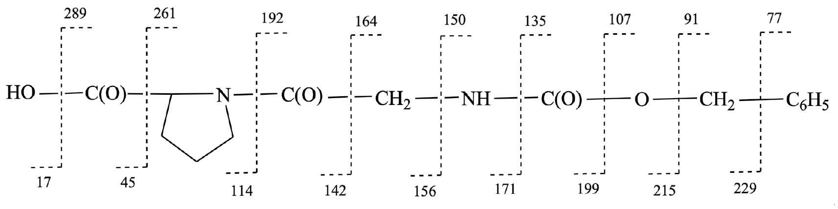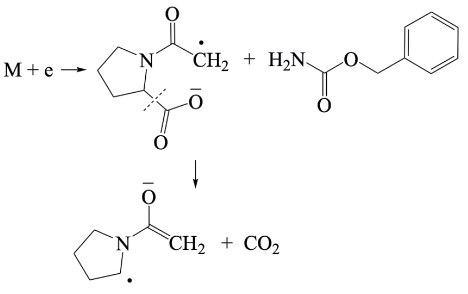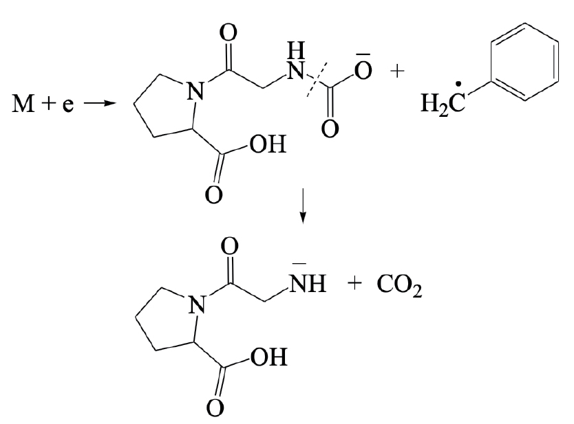 В результате проведенных исследований электронно-индуцированных реакций в модифицированном дипептиде N-бензилоксикарбонил-глицил-L-пролине была установлена их идентичность с реакциями в других ранее исследованных олигопептидах в аналогичных условиях. Распад молекулярных ионов в низкоэнергетической области осуществляется по большему числу каналов и с большей эффективностью, чем в высокоэнергетической области. Эти распады представляют собой реакции Н-сдвига, поскольку протекание многих реакций простого разрыва связей затруднено по энергетическим причинам. Перегруппировочный механизм заключается в миграции подвижного атома водорода СООН-группы к одному из радикальных центров, возникающих при разрыве внутренних связей в молекулярном ионе, что обусловлено возможностью образования низкоэнтальпийных ионов с карбоксильной структурой. Отличительной особенностью процессов в N-бензилоксикарбонил-глицил-L-пролине является выделение сверхинтенсивного иона с карбоксильной структурой депротонированного глицилпролина. Эта реакция заключается в последовательной фрагментации молекулярного иона, инициируемая выбросом бензильного фрагмента с последующим Н-сдвигом в промежуточном ионе и его декарбоксилированием.