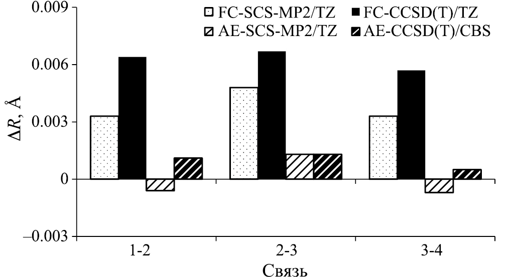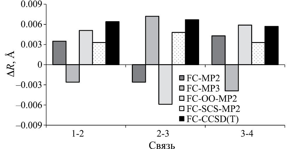 Видно, что ни учет поправки более высокого порядка (MP3) ни орбитальная оптимизация (OO-MP2) не исправляют проблему несогласованного описания длин одинарной и двойной связей. Но при использовании SCS-MP2 все связи удлинены по сравнению с экспериментом как и в CCSD(T). Это свидетельствует о том, что при использовании SCS варианта MP2 ошибка теории возмущений по сравнению с CCSD(T) меньше, чем в стандартном варианте, и не компенсируется ошибкой вызванной неучетом корреляции остовных орбиталей. Учет корреляции всех электронов (AE) и необходимая для этого замена базиса на cc-pwCVTZ в SCS-MP2 повышает точность до уровня, сопоставимого с точностью AE-CCSD(T)/CBS [8] (см. рис. 5).