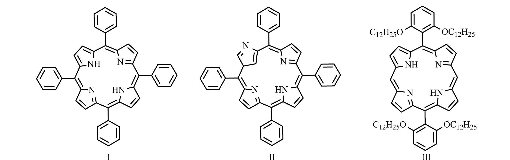 Материалы. Использовали коммерчески доступные порфирины 5,10,15,20-тетрафенилпорфирин (I) и 5,15-бис(2,6-бис(додецилокси)фенил)порфирин (III) фирмы Sigma-Aldrich (рис. 2). Соединение 2-аза-21-карба-5,10,15,20-тетрафенилпорфирин (II) (рис. 2) было синтезировано в соответствии с ранее описанными методами [42, 43]. Хлороформ 99% был стабилизирован амиленом (Sigma-Aldrich).