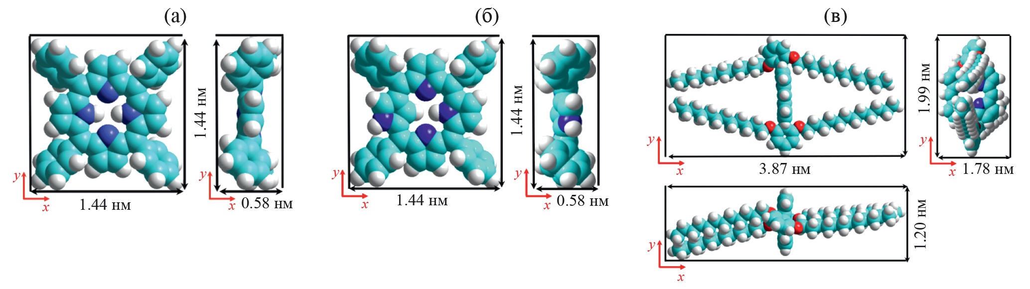 Для определения значения объема исследуемого раствора порфирина, которое необходимо нанести на поверхность субфазы со степенью покрытия cface = 69%, были рассчитаны модели молекул с использованием метода DFT в программе Gaussian 09 [44] (рис. 3).