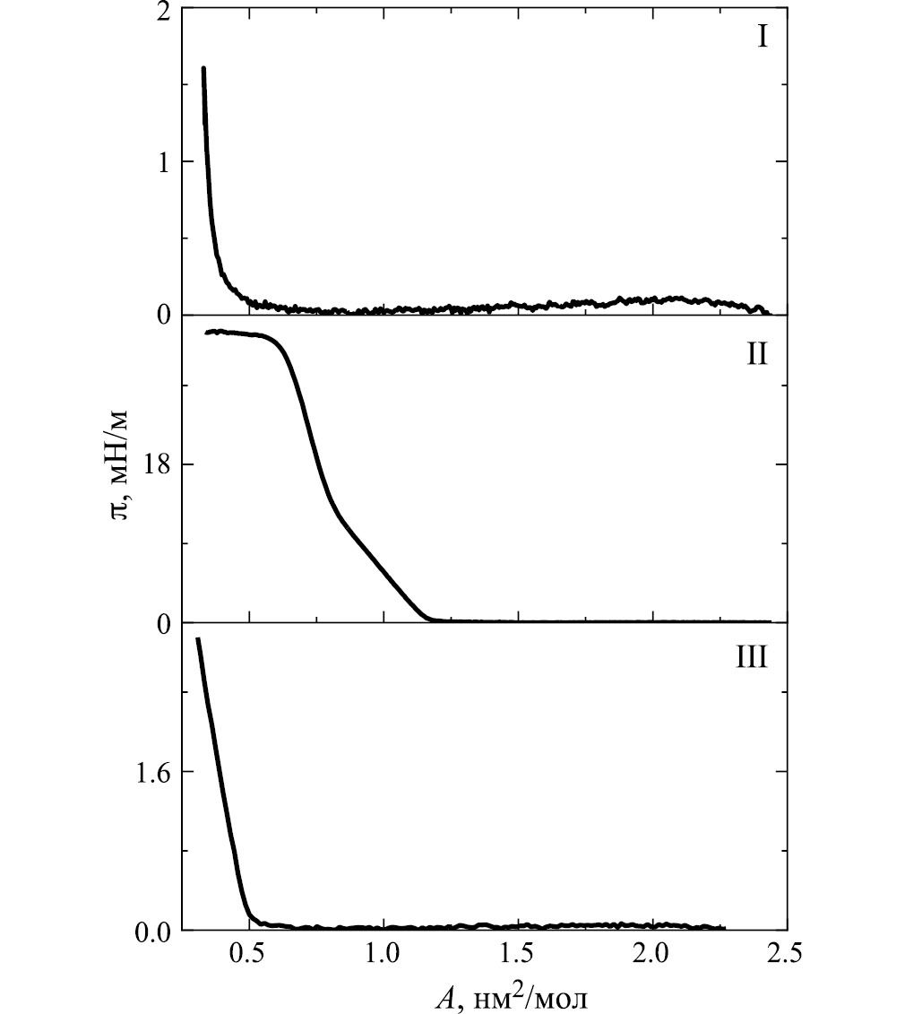 Общим для порфиринов I и III является резкое увеличение поверхностного давления, начиная с малых значений средней площади на молекулу в слое (рис. 4), что указывает на изменение состояния их плавающих слоев [25, 49]. Сопоставляя ход изотерм сжатия с классическими представлениями о типах поведения плавающих слоев классических амфифилов [25], им можно приписать формирование при 0.6–0.7 нм2/мол жидко-конденсированного состояния, затем переходящего в конденсированное [25, 49].