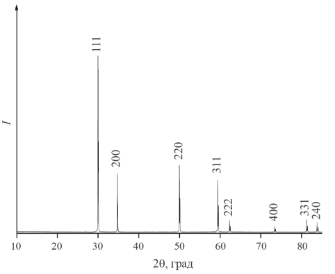 Рис. 1. Дифрактограмма образца твердого раствора Yb2O3‧2HfO2, структурный тип Fm3m, а = 5.157(1) Å, CuKα-излучение, λ = 1.5418 Å.