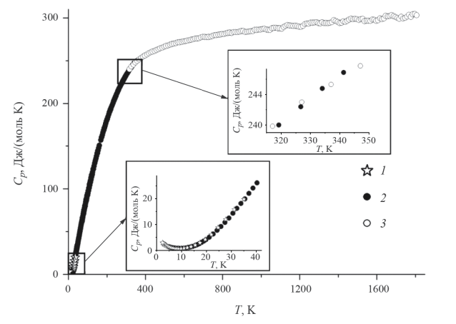 Измерения теплоемкости выполнены методами релаксационной 2.36–19.76 K (30 точек), адиабатической 4.97–246.9 K (143 точки) и дифференциальной сканирующей калориметрией 317–1807 K (150 точек). Экспериментальные результаты приведены в Приложении, таблица П1, и на рис. 2. Данные, полученные разными методами, удовлетворительно согласуются между собой, а температурная зависимость теплоемкости не содержит признаков структурных превращений.