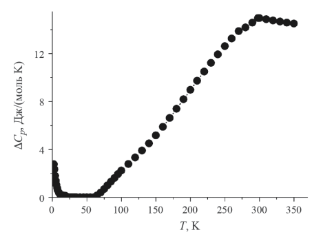 Сглаживание теплоемкости выполнено в области 2–40 K с использованием полинома пятой степени Cp=ΣAiT i (i=0…5), а в температурных интервалах 20–350 и 250–1800 K – с помощью программы CpFit, основанной на линейной комбинации функций Эйнштейна: Cp(T) = = 3RSai[(qi/T)2eqi/T/(eqi/T – 1)2], где R – универсальная газовая постоянная, ai и qi – варьируемые параметры [23, 24]. Сглаженные значения теплоемкости и рассчитанные значения термодинамических функций приведены в таблице 1, а параметры использованных моделей содержатся в табл.П2 Приложения.