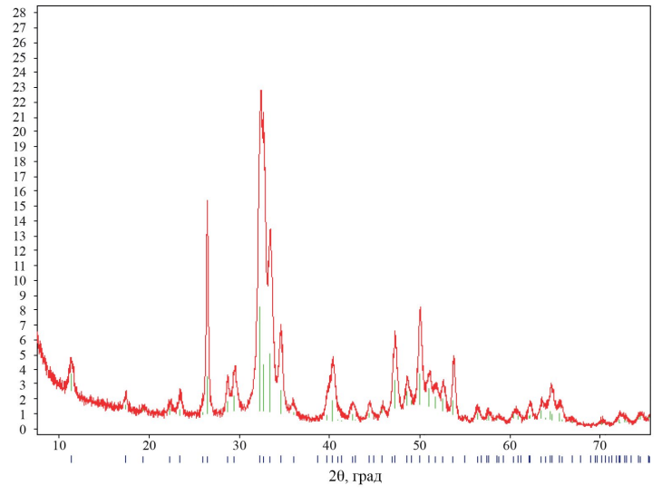 Идентификация полученного образца гидроксиапатита была выполнена методом рентгенофазового анализа на рентгеновском дифрактометре Rigaku “MiniFlex II” с CuKα-излучением. Сравнение полученной дифрактограммы исследуемого образца с имеющимися данными для гидроксиапатита показало присутствие только рефлексов структуры гидроксиапатита (01-072-1243 ICDD (PDF-2/Release 2011 RDB) и отсутствие рефлексов каких-либо других фаз. На рис. 1 приведена полученная дифрактограмма и проведенное отнесение рефлексов фазы гидроксиапатита обозначено штрих-диаграммой.