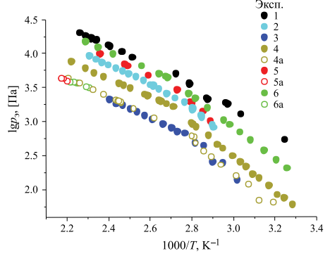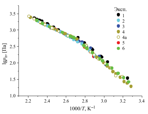 Рис. 1. Зависимости измеренного давления пара ДМФА от температуры в координатах lgpэ–1000/T в экспериментах 1–6.