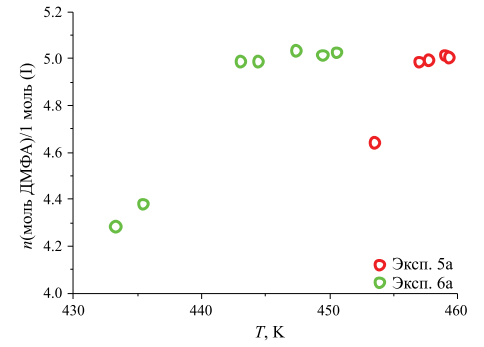 Для получения данных по ненасыщенному пару в экспериментах 4, 5 и 6 были изготовлены рабочие камеры с двумя отсеками, соединенными тонкой стеклянной перегородкой. В отсек с меньшим объемом загружалась навеска вещества и боек для разбивания перегородки, оба отсека вакуумировались, отсоединялись от вакуума при помощи газовой горелки и нуль-манометр помещался в печь установки. Первый цикл нагрев-охлаждение осуществлялся в маленьком объеме манометра, перед вторым нагревом перегородка между отсеками вскрывалась с помощью бойка и эксперимент продолжался в большом объеме (см. табл. 2 и рис. 1, эксперименты 4а, 5а и 6а). В экспериментах 5а и 6а получены данные по ненасыщенному пару (когда весь ДМФА, содержащийся в навеске, вышел в газовую фазу), из которых рассчитан состав исходного соединения, он соответствовал химической формуле (I)*5C3H7NO (рис. 2). В эксперименте 4а объем оказался недостаточным для выхода в ненасыщенный пар, здесь измерен только насыщенный пар, но в большем, чем в эксперименте 4, объеме.