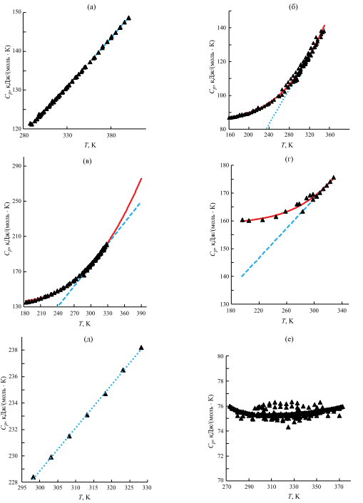Для уксусной кислоты линейная зависимость сохраняется и в широком интервале температур (рис. 1a), поэтому для ее описания достаточно корректно применение уравнения (12); отметим, что более сложные зависимости, уравнения (31) и (32)), приводят к таким же результатам. Имеющиеся литературные данные о Cp н-бутилацетата включают только линейный интервал 298.15 K – 328.15 K (рис. 1д), поэтому мы сочли возможным и в этом случае применять зависимость (12).