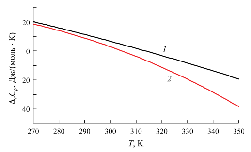 где fi0, fi1, fi2, fi3, – постоянные коэффициенты. С помощью уравнения (33) удалось достаточно адекватно представить зависимости Cp(T) для указанных веществ как гладкие монотонные функции. Коэффициенты уравнений, описывающих температурную зависимость теплоемкостей всех веществ приведены в табл. 2. Рассчитанные по этим уравнениям и уравнению (11) температурные зависимости изменений изобарной теплоемкости в ходе реакций, DrCp(T), приведены на рис. 2.