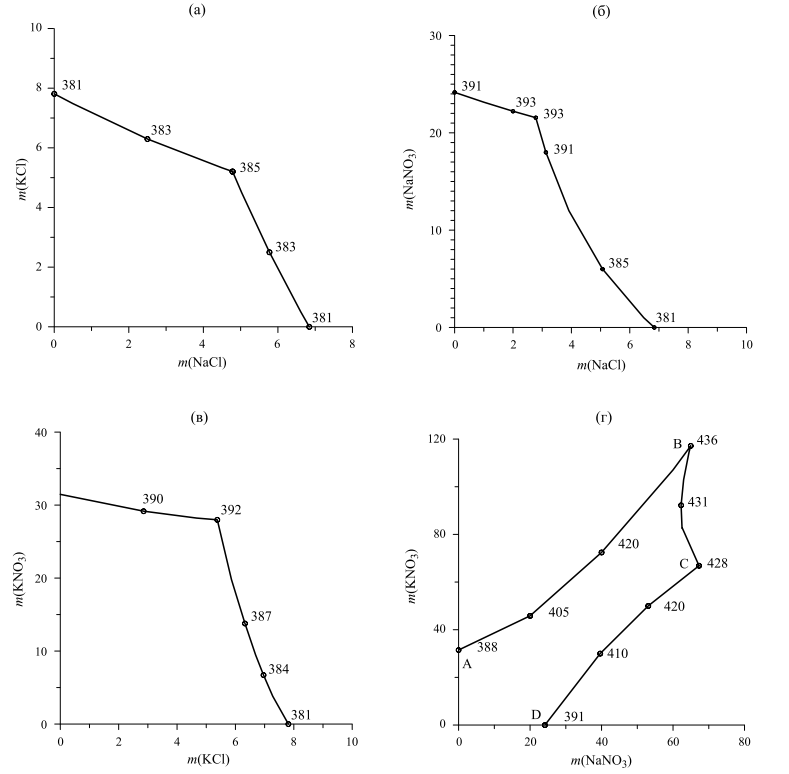 Рис. 2. Результаты расчета составов насыщенных водных растворов при парциальном давлении воды 1 бар в тройных системах, содержащих соли: а –NaCl, KCl, б – NaCl, NaNO3, в – KCl, KNO3, г – NaNO3, KNO3. Концентрации солей выражены в шкале моляльностей, температура – в К (цифры у точек). На г буквенные обозначения соответствуют следующим составам осадка: AB – KNO3, BC – NaNO3·KNO3, CD – NaNO3.