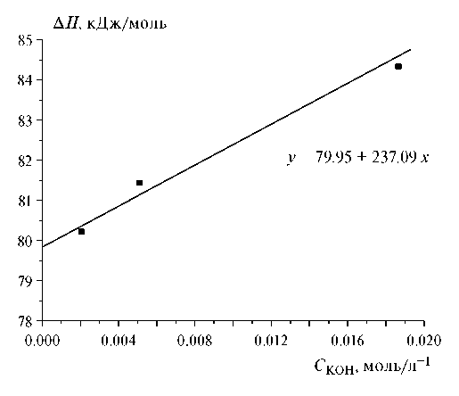 Графическая экстраполяция теплот растворения исследуемого соединения в растворах гидроксида калия к нулевой ионной силе представлена на рис. 1. Экспериментальные данные в табл. 2.