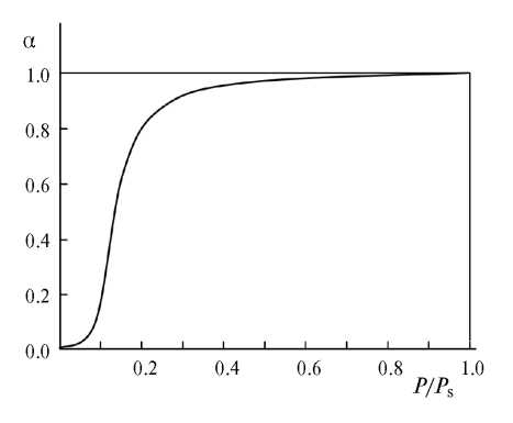 Численное решение системы (1), (2) с учетом (3) позволяет построить изотерму адсорбции водяного пара на поверхности ионита – зависимость β(P/Ps), рис. 1, а также найти зависимость степени диссоциации ионогенных групп от влажности воздуха α(P/Ps), рис. 2. При построении этих зависимостей использованы следующие значения параметров системы: