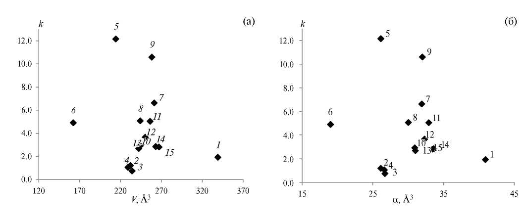 Рис. 1. Зависимости фактора удерживания исследованных веществ от объема (а) и поляризуемости (б) молекул исследованных веществ.