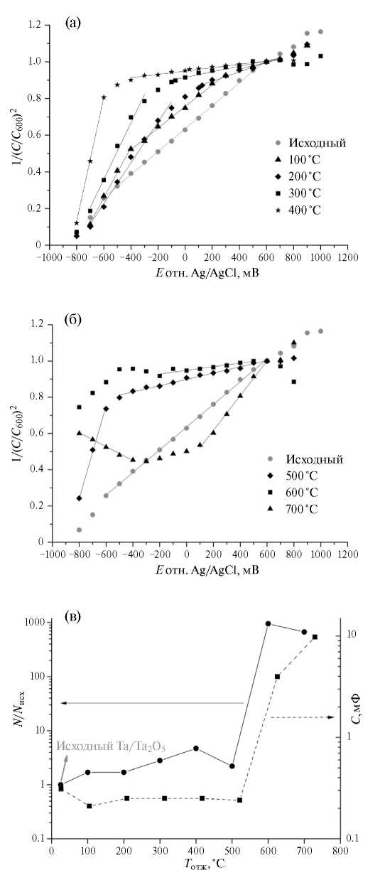 Влияние термообработок на зависимости 1/(С/С600)2 от потенциала образцов изучено в интервале температур от 100 до 700°C (рис. 3а, б). При термической обработке пленок аморфного Ta2O5 на тантале идет так называемое растворение оксида в тантале, обусловленное диффузией атомов кислорода из оксида в металл, которая возможна уже при T=200°C [22]. Обеднение кислородом оксидного слоя приводит к увеличению концентрации кислородных вакансий, что должно сказываться на емкостных характеристиках.