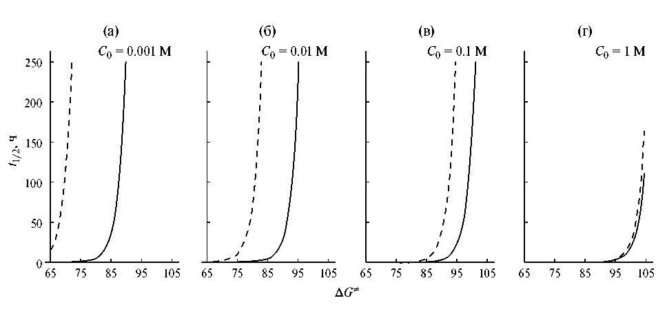 Рис. 3. Зависимости времени полуреакции t1/2 от значений свободной энергии активации ΔG≠ (кДж/моль) для би- (сплошные линии) и тримолекулярных (штриховые линии) реакций при различных начальных концентрациях C0 = 0.001 (а), 0.01(б), 0.1(в), 1М (г) и температуре T = 25°C.
