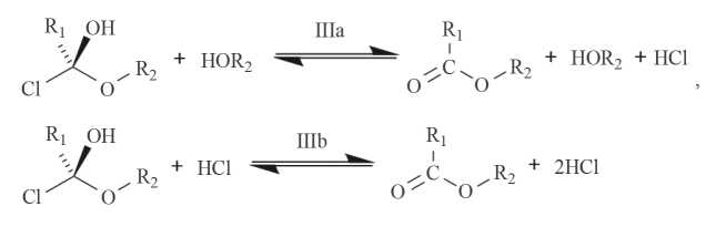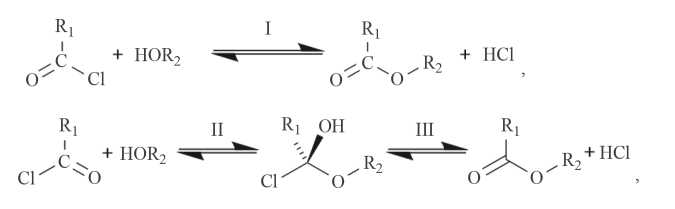 В неполярных средах реакции замещения по одинарным связям углерод–хлор и присоединения к кратным связям углерод–кислород нуклеофильных реагентов (Н2О, ROH, RCOOH) предполагает общий характер поведения ацилхлоридов [1–3]. Система ацилхлорид–гидроксилсодержащее соединение может быть представлена одно- и многостадийным процессами