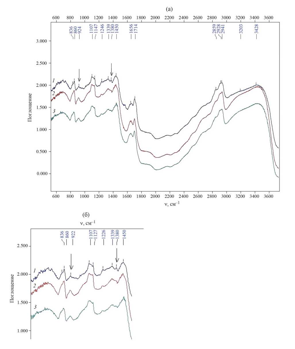 Рис. 3. ИКС-спектры для чистого ПВС (1), композитной пленки ПВС-Ag, не облученной УФ (2), композитной пленки ПВС-Ag, облученной УФ (3), (а); увеличенный участок данного спектра (б).