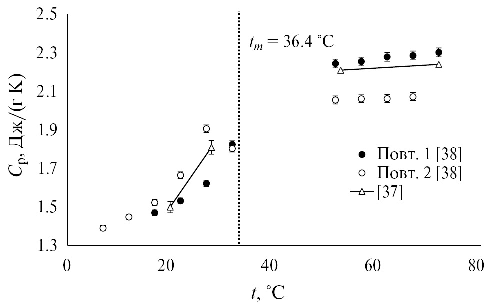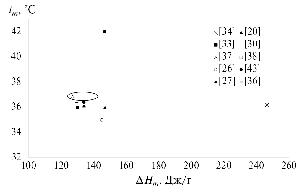 В работе [39] энтальпия плавления совпадает с указанным значением и составляет 134 Дж/г, а температура плавления – 36.4°C с указанной погрешностью метода ДСК – 10%. Энтальпию кристаллизации авторы данной работы не определяли. Несмотря на корреляцию с работами [37, 38], в данной работе слишком высокая систематическая составляющая погрешности, что приводит к завышенному доверительному интервалу ±2.09°C для tm и ±14.4 Дж/г для ΔHₘ.