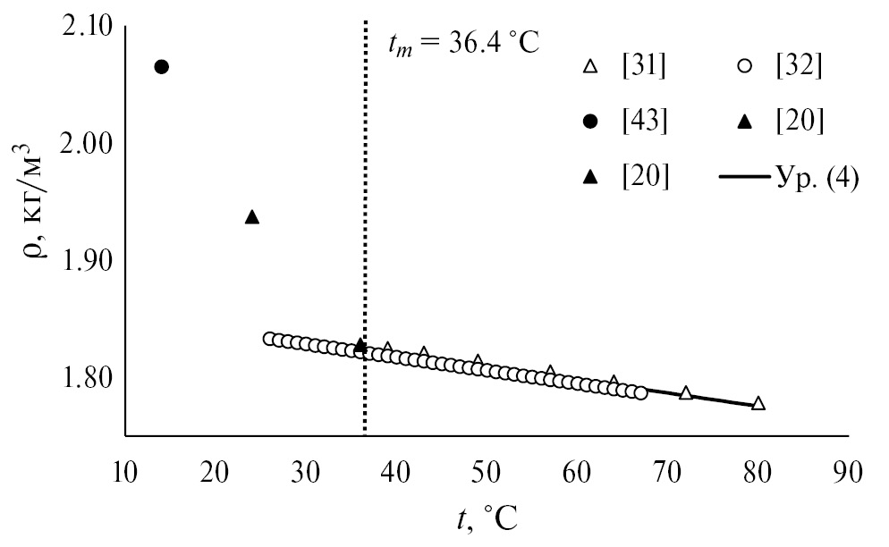 На рис. 2 видно, что значение плотности в жидкой фазе при 36°C, полученное в работе [20], вписывается в линейную зависимость ряда данных из работы [31], поэтому промежуточное регрессионное уравнение рассчитано с учетом дополнительной экспериментальной точки из работы [20].