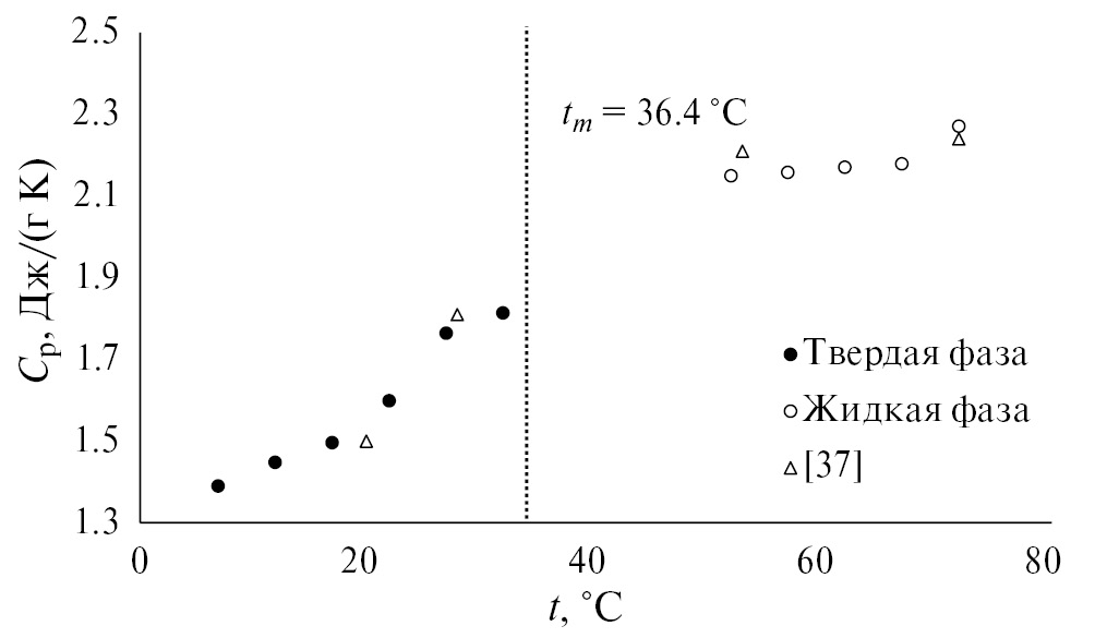 Среднее значение энтальпии плавления по данным [37, 38] составляет 133.5±1.97 Дж/г, с температурой плавления 36.85±0.55°C. Средняя энтальпия кристаллизации составляет 133±2°C, что коррелирует с энтальпией плавления в пределах погрешности. Все погрешности усреднены по правилам сложения систематических погрешностей.