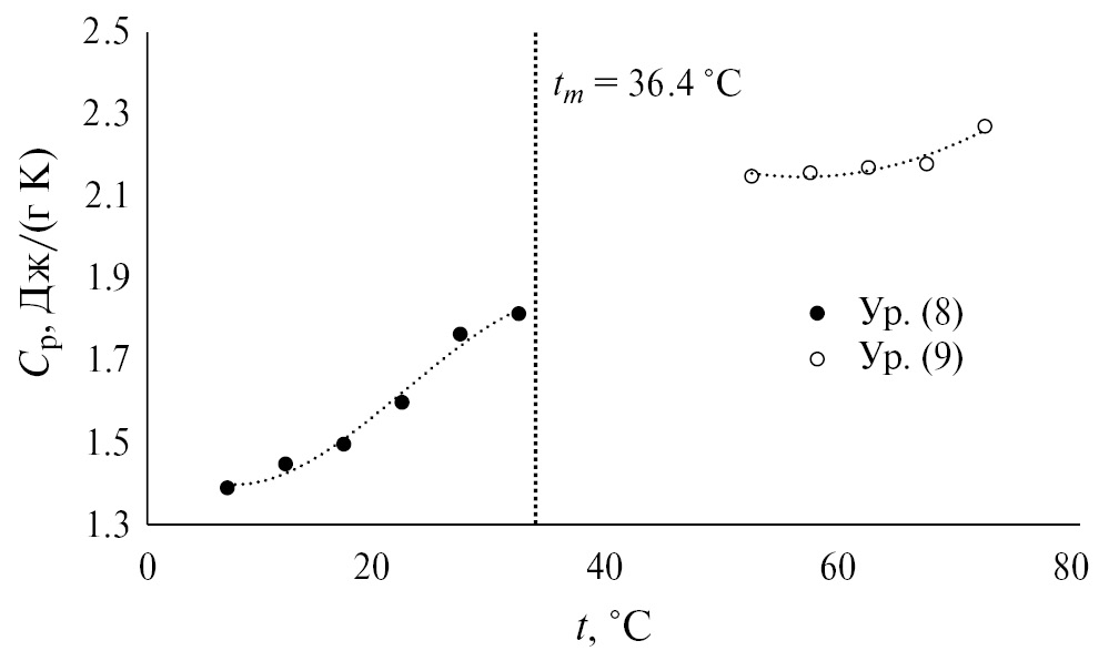Для образца 2 характерны аномальные значения при повышении температуры. Авторы предполагают, что образец мог разложиться при длительном хранении из-за нарушения правил хранения гидратов, либо в процессе экспериментальных измерений. По этой причине в расчетах достоверных данных учитываются данные лишь одного из образцов. В работе [37] не представлено регрессионного уравнения, а выделены лишь температурные диапазоны измеренной теплоемкости и ее границы в твердой и жидкой фазах. Более того, в обобщающей работе [1] зависимость Cp(T) в твердой фазе перерисована в линейный вид, в то время как в оригинальной работе [37] нелинейная зависимость. Поэтому при согласовании данных между работами [38] и [37] из второй работы были взяты только краевые значения 1.5 и 1.81 при 19.85 и 27.85°C соответственно в твердой фазе, а также 2.21 и 2.24 при 52.85 и 71.85°C соответственно в жидкой фазе.