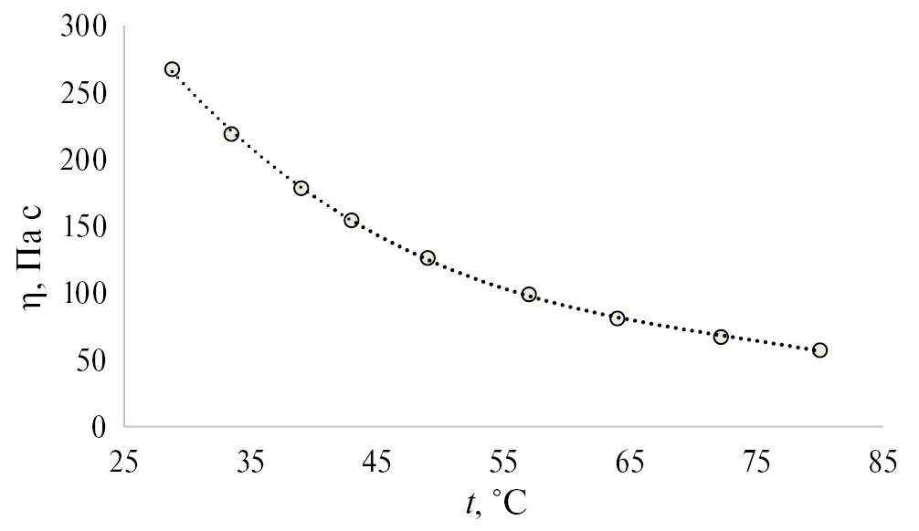 При понижении температуры от 80 до 28°С, вязкость убывает по степенному закону и описывается регрессионным уравнением (10) средняя ошибка аппроксимации которого A=1.4%: