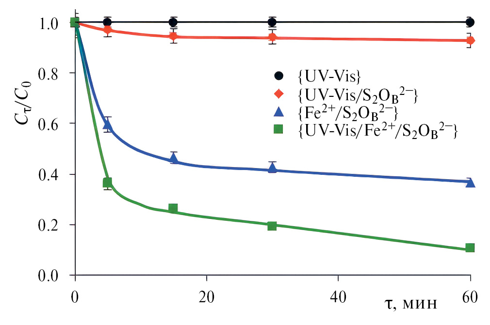 При введении в раствор Fe₂⁺процесс окислительной деструкции целевого соединения существенно интенсифицируется. Так, в комбинированной системе {UV–Vis/Fe₂⁺/S₂O₈²⁻} через 60 мин экспозиции эффективность окисления ЦЕФ возросла до 90% (рис. 1), а через 180 мин антибиотика в растворе не обнаружено.