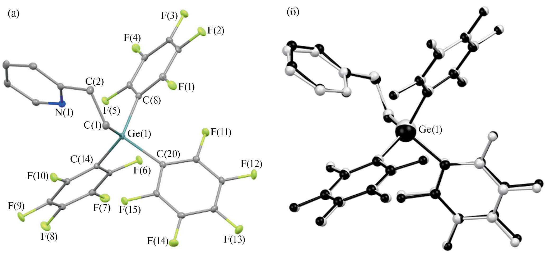 Энергия взаимодействий в координационной сфере атома германия, полученная в рамках чисто теоретического подхода систематически меньше, соответствующих значений, полученных с использованием кристаллических инвариомов. В целом, энергия всех четырех Ge-C-связей варьируется в диапазоне 40.9–59.9 ккал/моль (табл. 4). Вне зависимости от способа получения распределения ЭП, исследование ее топологии позволило обнаружить связевую критическую точку (3, –1), соответствующую Ge(1)-N(1) взаимодействию. Отметим, что в отличие от Ge-C связей, контакт Ge(1)-N(1) относится к типу взаимодействий закрытых оболочек (∇2ρ(r) > 0; (he(r) > 0), а его энергия существенно ниже и составляет 2.7–5.0 ккал/моль. Таким образом, трис(пентафторфенил)-2-пиридилэтилгерман следует рассматривать, как пятикоординационный комплекс германия. На основе значений τ5 параметра (0.79–0.82) атом германия во всех независимых молекулах Iа и Iб принимает искаженную тригонально-бипирамидальную геометрию [44].