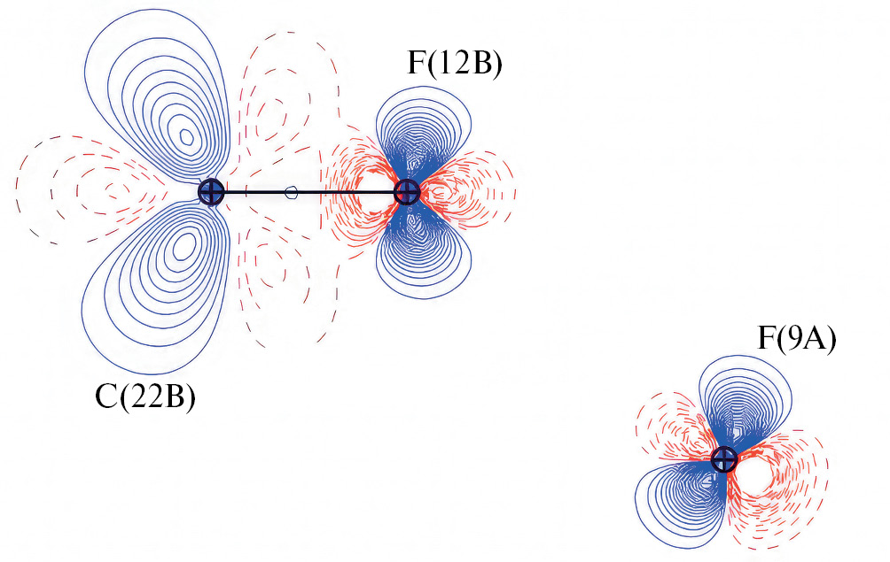 Рис. 9. Распределение ДЭП (±0.05 е/Å–3) в комплексе Iаinv в плоскости межмолекулярного C(22B)–F(12B)…F(9A) взаимодействия. Сплошные линии соответствуют области концентрации ЭП, а пунктирные – области разрежения ЭП.