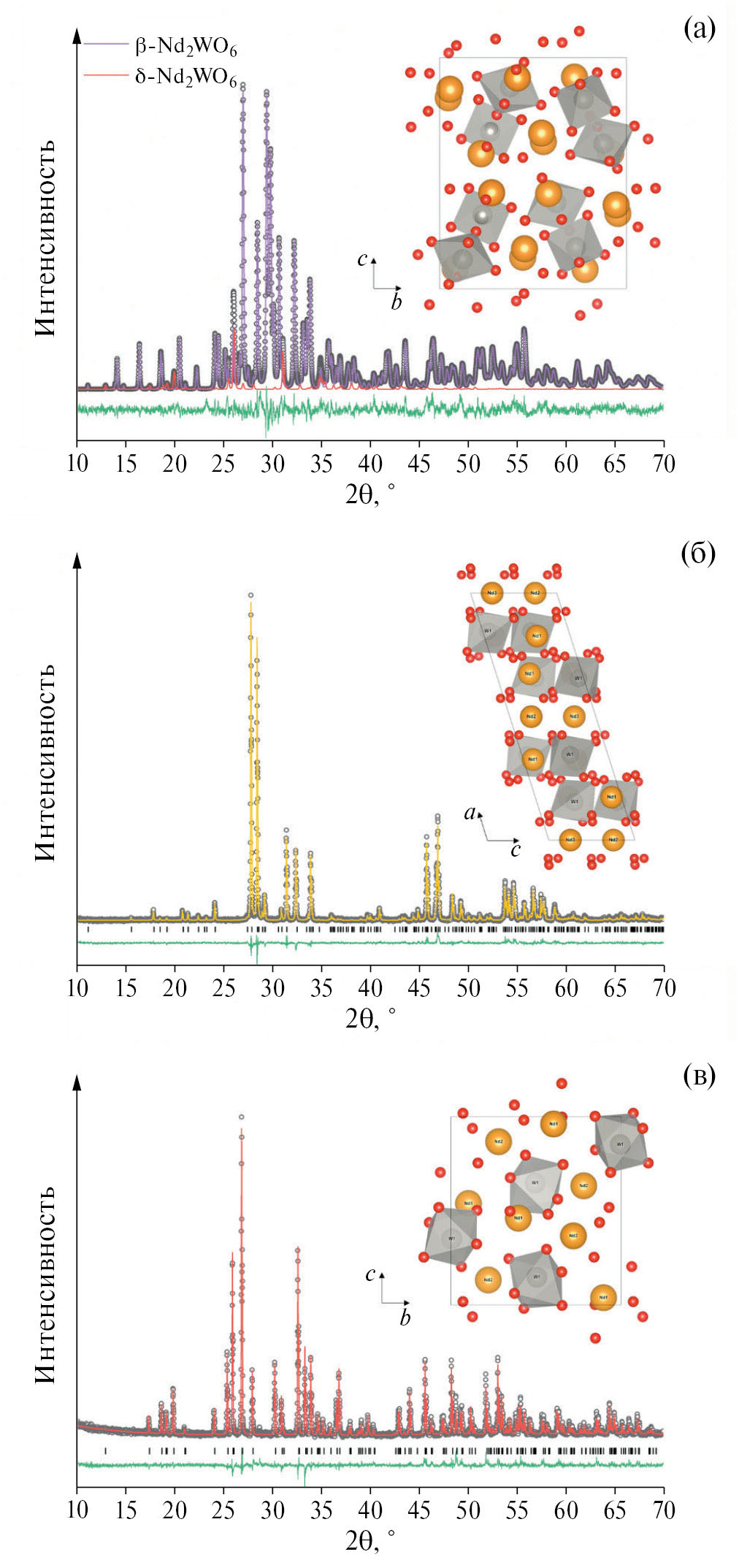 Рис. 2. Уточнение структуры исследуемых керамик по методу Ритвельда. а) Образец, полученный после отжига при 700°C, 4 ч, состоит из двух ромбических фаз пр. гр. P2₁2₁2₁ (19): β-Nd₂WO₆ и δ-Nd₂WO₆. На вставке проекция структуры β-Nd₂WO₆. б) Моноклинный Nd₂WO₆, полученный после отжига при 1500°C, 1 ч. На вставке проекция структуры моноклинной модификации Nd₂WO₆ пр. гр. C12/c1 (15). в) Ромбический δ-Nd₂WO₆, полученный после отжига при 1600°C, 1 ч. На вставке проекция структуры ромбической модификации δ-Nd₂WO₆ пр. гр. P2₁2₁2₁ (№ 19). Черточками отмечены позиции пиков, снизу приведена разность между экспериментальными и расчетными данными.