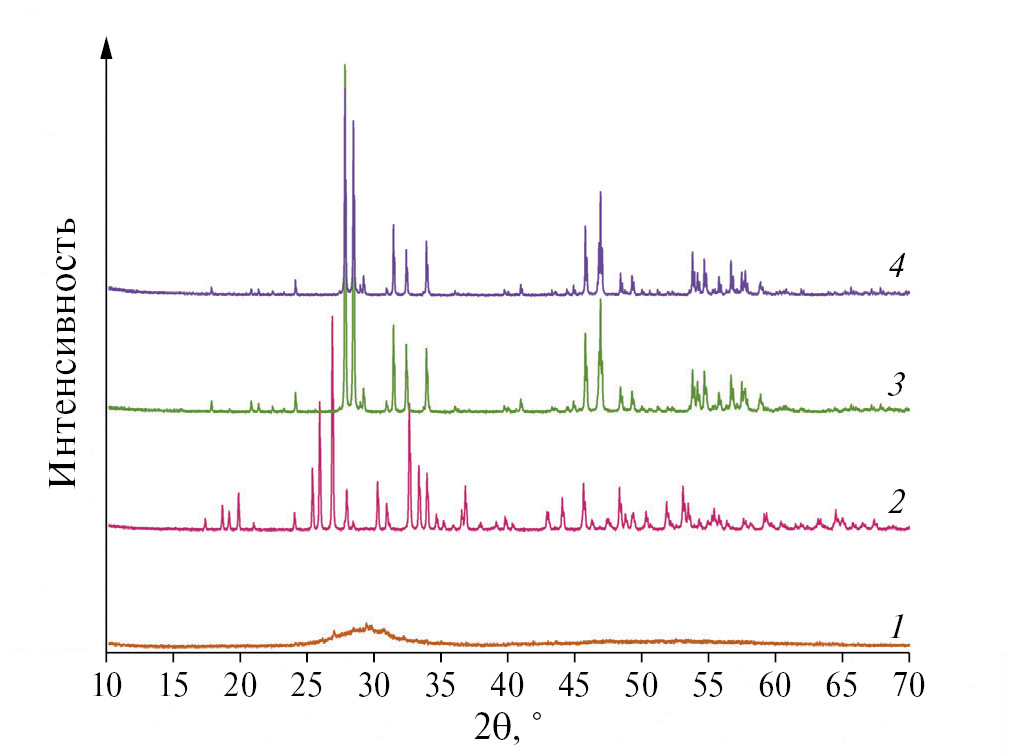 Интересный результат был получен при дополнительных отжигах керамик (рис. 3). В то время как отжиг моноклинной фазы Nd₂WO₆ в течение 40 и 80 ч при 1200°C не привел к какому-либо существенному изменению структуры (рис. 3, кривая 3), дополнительный отжиг керамики, полученной сначала при 900°C, 4 ч, в течение 96 ч при этой же температуре дал возможность получить чистую ромбическую модификацию δ-Nd₂WO₆, не прибегая к высокотемпературному отжигу при 1600°C (рис. 3, кривая 2). δ-Nd₂WO₆, получаемый при высоких температурах, согласно [15] является метастабильным. Его метастабильность подтвердил дополнительный отжиг образца δ-Nd₂WO₆, полученного при 1600°C, 1ч, при 1400°C в течение 1 ч. После такой процедуры δ-Nd₂WO₆ полностью перешел в моноклинную фазу (рис. 3, кривая 4). Образец, подвергнутый выдержке при 600°C в течение 100 ч, остался преимущественно рентгеноаморфным (рис. 3, кривая 1). На его дифрактограмме слегка проявились основные линии фазы β-Nd₂WO₆.