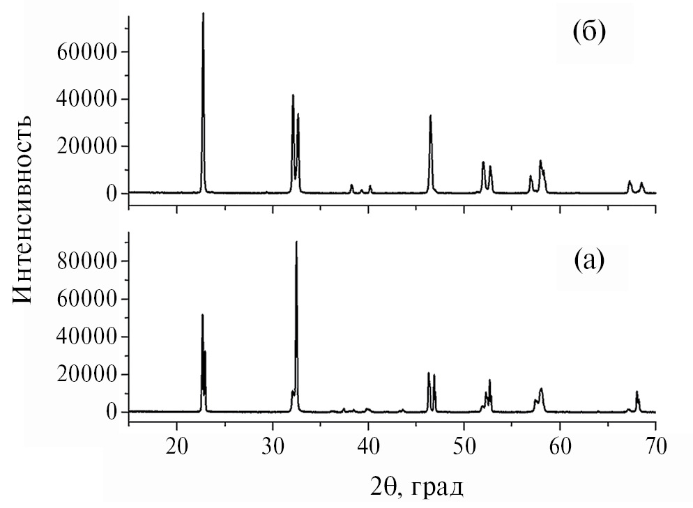 Рис. 1. Дифрактограммы образцов NN-LN, допированных LiF, с x = 0 (а), 0.05 (б).