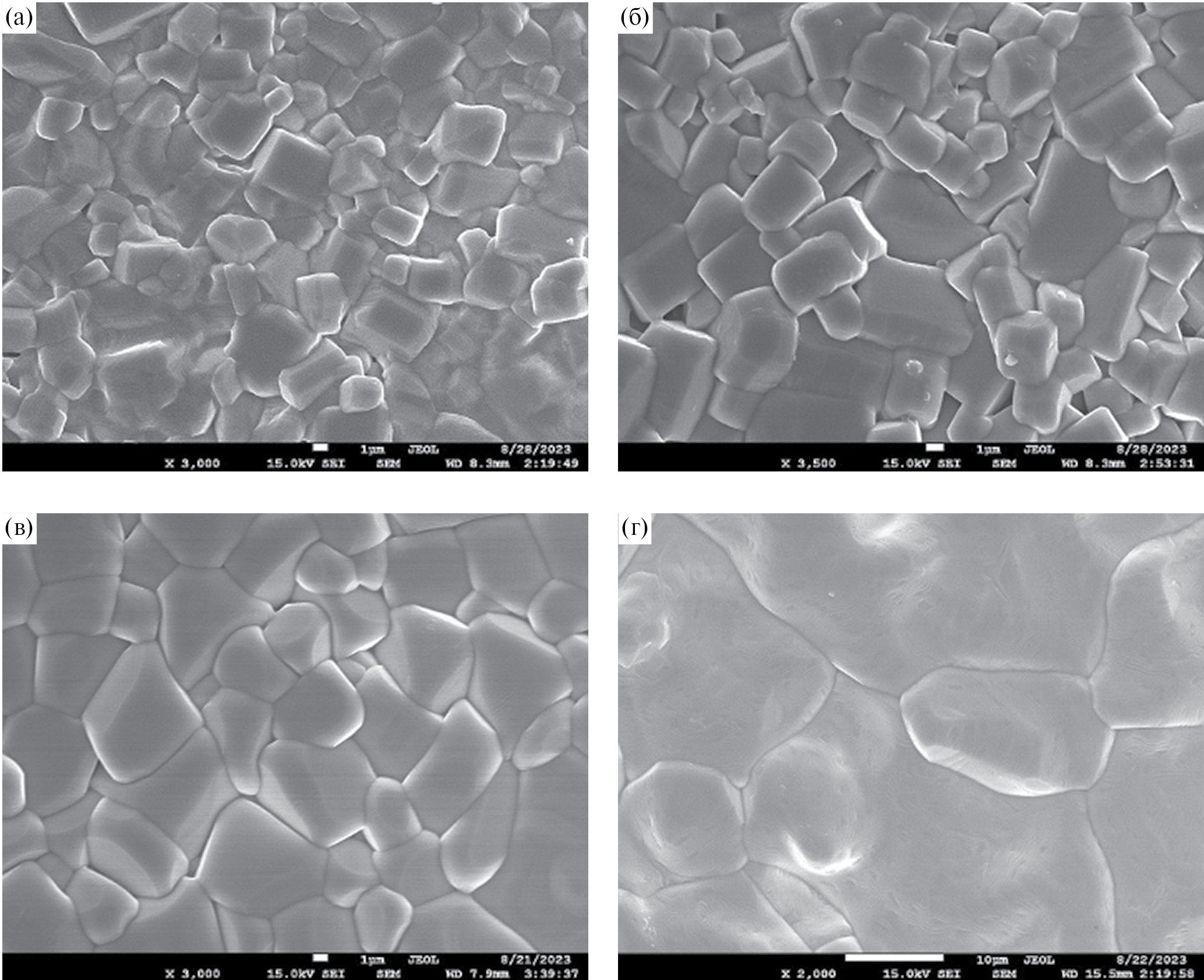 В результате изучения микроструктуры образцов методом растровой электронной микроскопии высокого разрешения выявлено, что образцы керамик исходного состава NN-LN состоят преимущественно из зерен октаэдрической формы, размеры которых варьируются от 2–3 мкм до 8–10 мкм (рис. 3а, б), в то время как в допированных фторидом лития образцах наблюдается значительный рост зерен, увеличивающийся по мере повышения содержания катионов лития в образцах. Кроме того, в образцах исходного состава с х = 0 и х = 0.05 границы зерен четкие (рис. 3а, б), а в модифицированных образцах границы зерен округляются, что свидетельствует o возможном подплавлении кристаллитов в результате жидкофазного механизма спекания в присутствии легкоплавкой добавки (рис. 3в, г). Модифицирование керамики добавкой фторида лития приводит к увеличению среднего размера зерен до значений ~ 10–15 мкм в образцах с х = 0 и х = 0.05 и ~ 20–25 мкм в образцах с х = 0.10 и х = 0.15 (рис. 3в, г). Модифицированные образцы характеризуются плотной упаковкой зерен, что подтверждается высокими значениями плотности керамик (~95%).