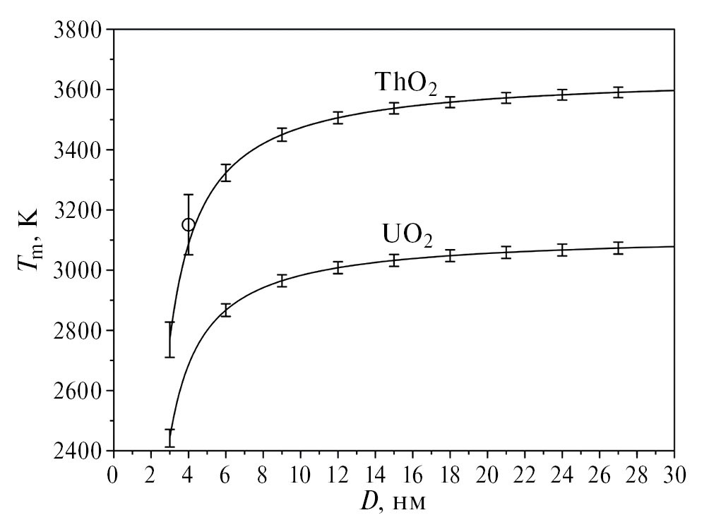 Как показано в работе [14], нанокристаллический ThO₂ с размером зерен (4 ± 1) нм плавится при температуре на 400–600 К ниже температуры макроскопического образца (рис. 3). Отдельно стоящие наночастицы ThO₂ с D = 4 нм плавятся при температуре 2507 К, что на 1144 К ниже температуры плавления соответствующих макроскопических частиц (см. рис. 1 б). Расчет методом МСС также показывает, что нанокристаллический ThO₂ с размером зерен 4 нм плавится при температуре 3087 К (рис. 3), что на 564 К ниже температуры плавления макроскопического образца и хорошо согласуется с упомянутым выше экспериментальным результатом. Плавление нанокристаллического UO₂ с размерами зерен в диапазоне (30 ± 20) нм было исследовано в работе [15]. Нанокристаллический UO₂ подвергся быстрому окислению из-за высокой удельной поверхности, поэтому измеренное в работе снижение температуры плавления более чем на 300 К ниже 3120 К (температуры плавления частиц UO₂ микрометрового размера) было в основном связано с существенным увеличением молярного отношения кислорода к урану и лишь в гораздо меньшей степени с влиянием размера зерен. Это не позволило сопоставить полученную в [15] температуру плавления нанокристаллического UO₂ с результами расчетов зависимости Tm = Tm(D) методом МСС (рис. 3).
