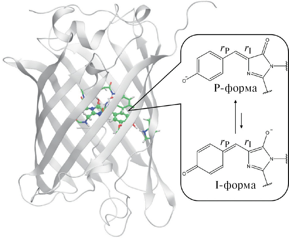 Зеленый флуоресцентный белок и его аналоги являются наиболее популярным средством визуализации в живых системах [1]. Они широко применяются для селективного окрашивания клеток и тканей, для мониторинга клеточных процессов [2, 3], спектроскопии сверхвысокого разрешения [4, 5] и в качестве сенсоров [6–8]. Эти белки представляют собой бочонки, состоящие из β-листов (рис. 1); внутри каждого такого бочонка расположен хромофор, который формируется автокаталитически из трех аминокислотных остатков, входящих в полипептидную цепь белка [9]. Изменение спектральных свойств флуоресцентных белков осуществляется как за счет изменения размера сопряженной π-системы хромофора, так и за счет его окружения [10]. Белки с одинаковым хромофором и разным аминокислотным окружением могут иметь спектры поглощения, различающиеся положениями максимумов на 30–40 нм.