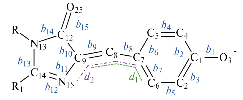 В литературе на протяжении многих лет обсуждается взаимосвязь геометрических параметров хромофора, а также свойств, зависящих от электронной плотности, и спектральных свойств [11–17]. В частности, наиболее важными геометрическими характеристиками являются длины связей на мостике между фенильным и имидазолидоновым фрагментами хромофора (рис. 1) [11]. Во флуоресцентном состоянии, которое наиболее интересно для прикладных исследований, хромофор находится в анионной форме, и существует равновесие между двумя таутомерными формами: P-формой с фенолят-анионом и I-формой c отрицательным зарядом, локализованным на кислороде пятичленного цикла (рис. 1). В литературе для описания таутомерного равновесия в хромофоре зеленого флуоресцентного белка используется понятие чередования длин связей BLA (от англ. bond length alternation), которое определяется как разность длин связей на мостике rP – rI. Показано, что BLA во многом определяет положение максимума спектральной полосы поглощения для белков с хромофором зеленого флуоресцентного белка [11], однако для белков, содержащих более протяженные π-системы, эта закономерность выполняется хуже [12].